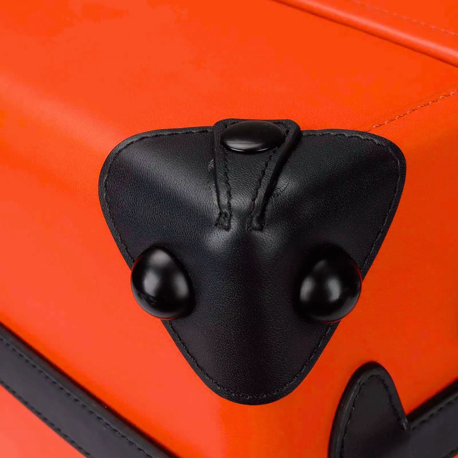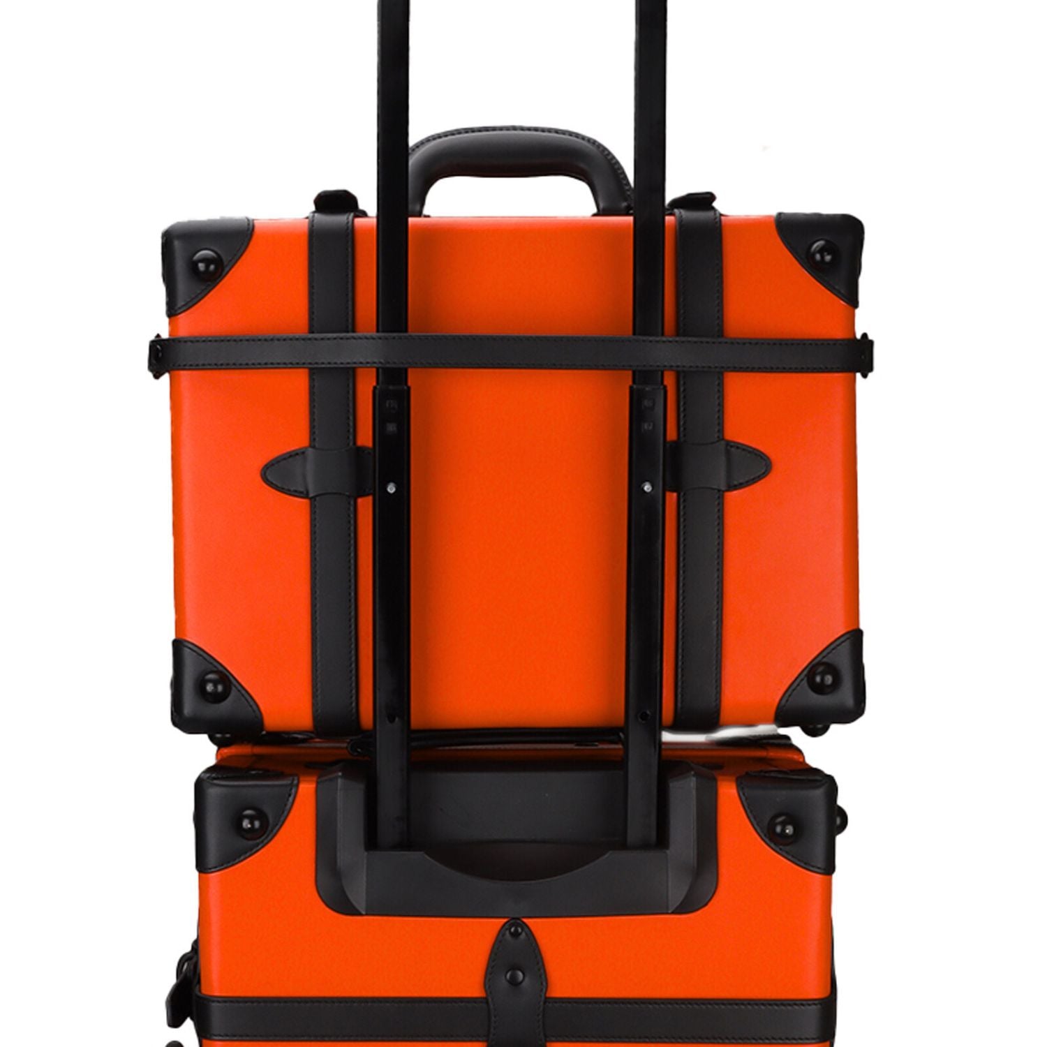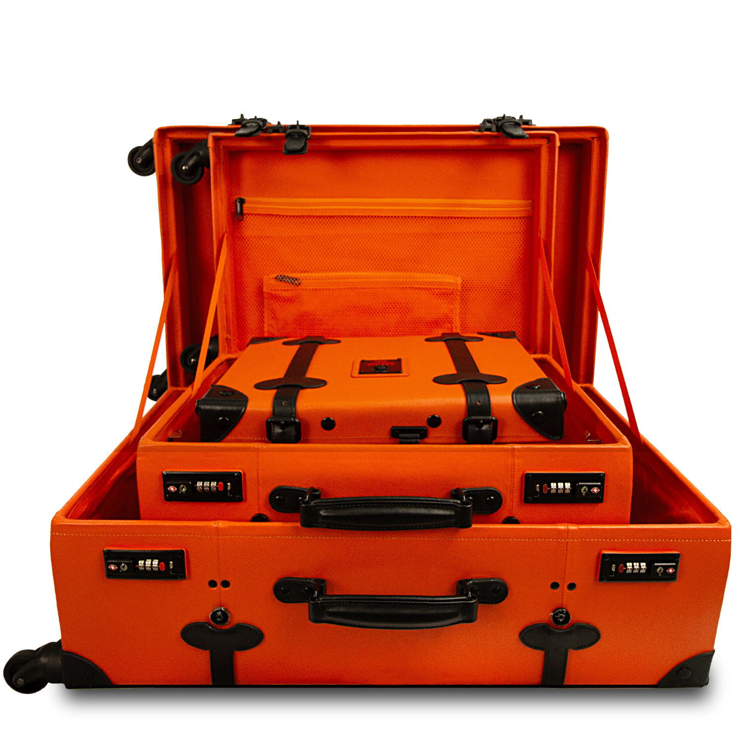 The set includes three premium trunks that nest perfectly together: a large trunk for extended travel, a carry-on trunk for weekend getaways, and a handheld case for daily adventures. All feature the same handcrafted quality and signature orange leather.