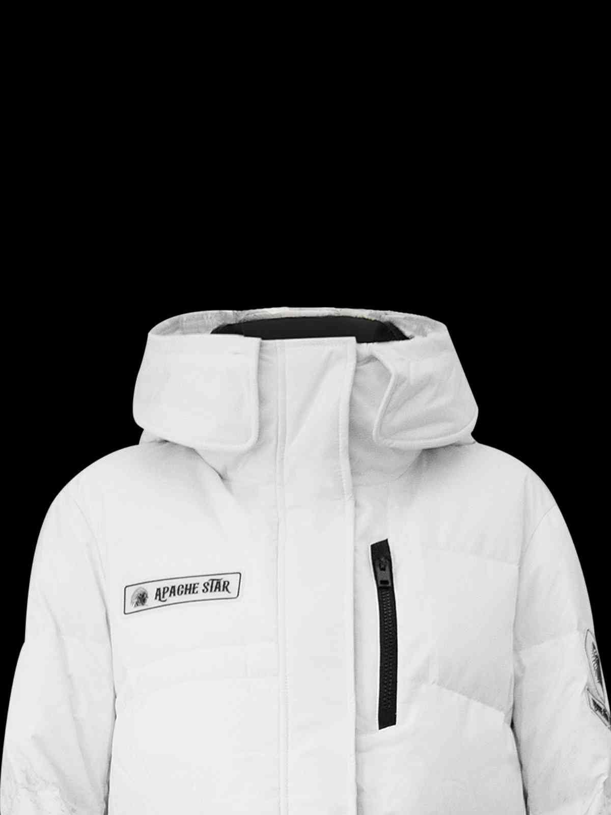 Step into the ultimate fusion of adventure-ready performance and head-turning style with the Trident Trooper black white mountain down coat by APACHE STAR. Designed for those who dare to brave the harshest elements, this coat channels the resilience of polar bears in Antarctica, offering unparalleled warmth and protection whether you're navigating urban streets or mountain peaks.